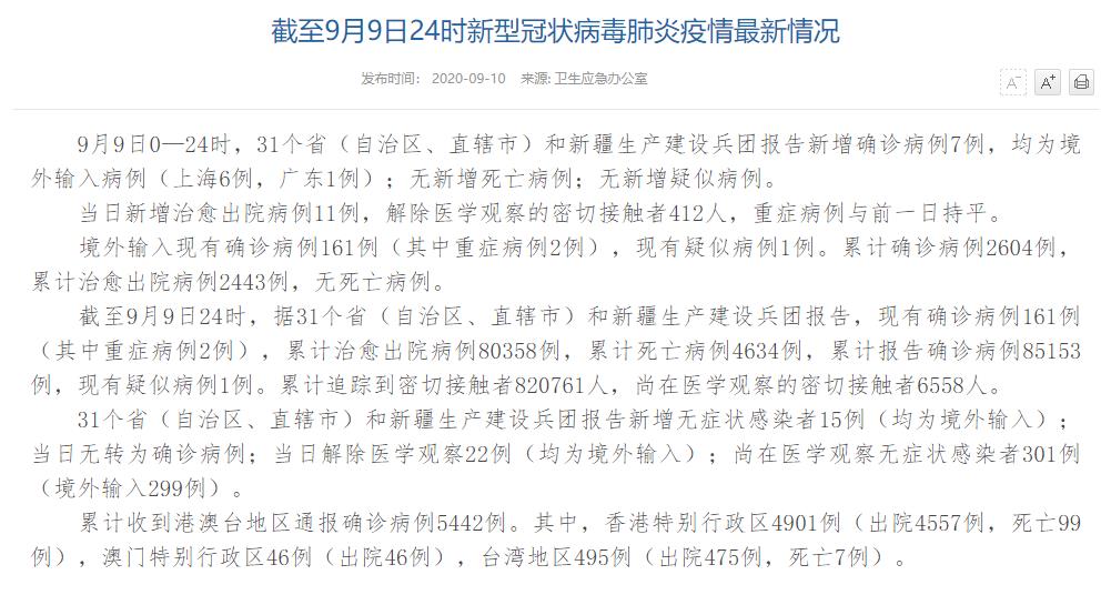 情況顯示,截至9月9日24時,據(jù)31個?。ㄗ灾螀^(qū)、直轄市)和新疆生產(chǎn)建設(shè)兵團報告,現(xiàn)有確診病例161例(其中重癥病例2例),累計治愈出院病例80358例,累計死亡病例4634例,累計報告確診病例85153例,現(xiàn)有疑似病例1例。累計追蹤到密切接觸者820761人,尚在醫(yī)學觀察的密切接觸者6558人。