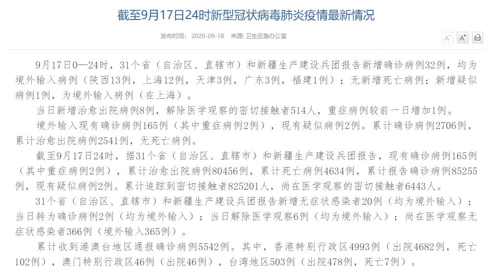 人民網(wǎng)北京9月18日電(董童)國家衛(wèi)生健康委于今日在官網(wǎng)發(fā)布的《截至9月17日24時新型冠狀病毒肺炎疫情最新情況》(以下簡稱“情況”)提出,9月17日0—24時,31個?。ㄗ灾螀^(qū)、直轄市)和新疆生產(chǎn)建設(shè)兵團(tuán)報告新增確診病例32例,均為境外輸入病例(陜西13例,上海12例,天津3例,廣東3例,福建1例);無新增死亡病例;新增疑似病例1例,為境外輸入病例(在上海)。當(dāng)日新增治愈出院病例8例,解除醫(yī)學(xué)觀察的密切接觸者514人,重癥病例較前一日增加1例。
