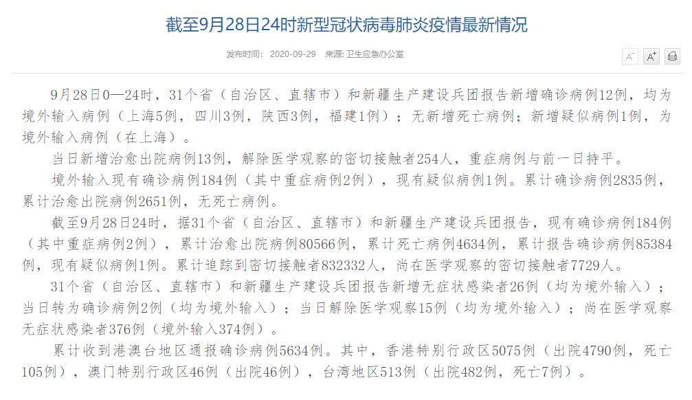情況顯示,截至9月28日24時,據(jù)31個省(自治區(qū)、直轄市)和新疆生產(chǎn)建設(shè)兵團報告,現(xiàn)有確診病例184例(其中重癥病例2例),累計治愈出院病例80566例,累計死亡病例4634例,累計報告確診病例85384例,現(xiàn)有疑似病例1例。累計追蹤到密切接觸者832332人,尚在醫(yī)學(xué)觀察的密切接觸者7729人。