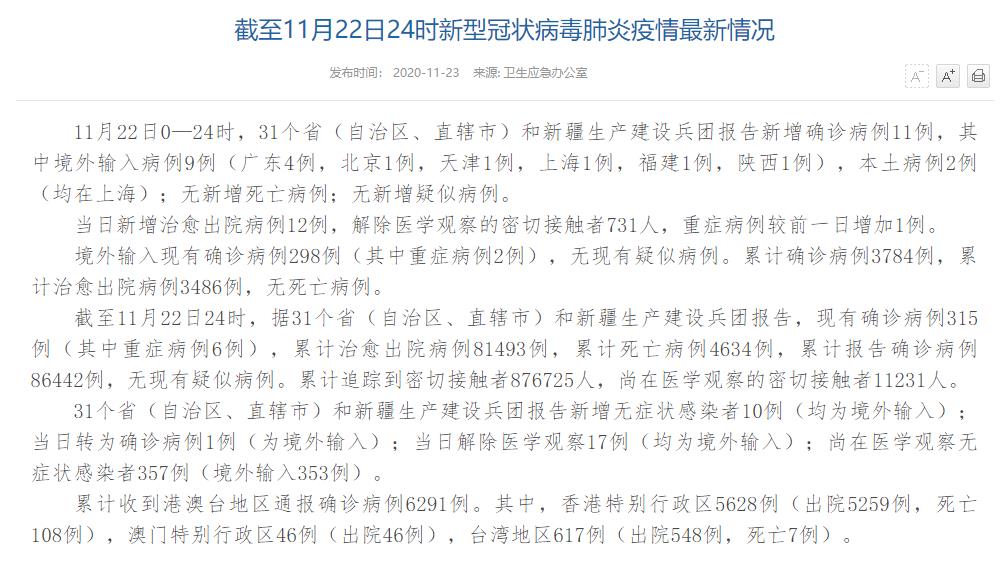 情況顯示,截至11月22日24時,據(jù)31個?。ㄗ灾螀^(qū)、直轄市)和新疆生產(chǎn)建設(shè)兵團報告,現(xiàn)有確診病例315例(其中重癥病例6例),累計治愈出院病例81493例,累計死亡病例4634例,累計報告確診病例86442例,無現(xiàn)有疑似病例。累計追蹤到密切接觸者876725人,尚在醫(yī)學觀察的密切接觸者11231人。