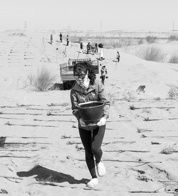 3月31日,一名青年志愿者正在取水澆灌。當日,200余名中韓兩國青年志愿者來到內蒙古自治區(qū)達拉特旗庫布其沙漠種樹。2006年起,中國國際青年交流中心與韓國韓中文化青少年協(xié)會組織兩國青年志愿者在庫布其沙漠植樹,參與防沙固沙項目。截至目前已植樹850多萬株,造林3萬多畝。新華社記者劉磊攝
