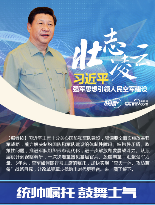 【聯(lián)播+】5年前的4月14日,中共中央總書(shū)記、國(guó)家主席、中央軍委主席習(xí)近平專程到空軍機(jī)關(guān)調(diào)研空軍建設(shè)和軍事斗爭(zhēng)準(zhǔn)備,代表黨中央、中央軍委向空軍全體官兵致以誠(chéng)摯的問(wèn)候,強(qiáng)調(diào)要加快建設(shè)一支空天一體、攻防兼?zhèn)涞膹?qiáng)大人民空軍,為實(shí)現(xiàn)中國(guó)夢(mèng)、強(qiáng)軍夢(mèng)提供堅(jiān)強(qiáng)力量支撐。