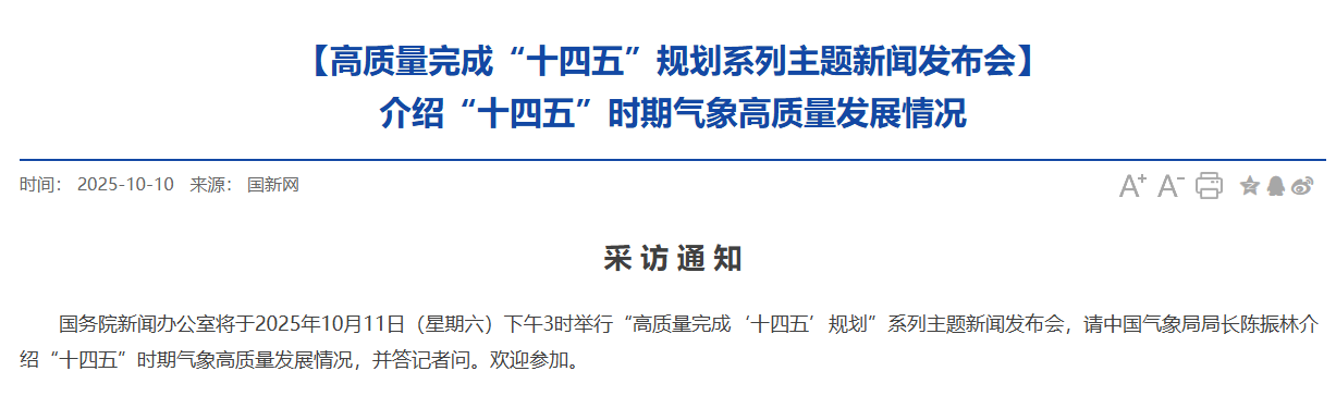 ??今日下午3時 國務院新聞辦公室將于2025年10月11日(星期六)下午3時舉行“高質量完成‘十四五’規(guī)劃”系列主題新聞發(fā)布會,請中國氣象局局長陳振林介紹“十四五”時期氣象高質量發(fā)展情況,并答記者問。