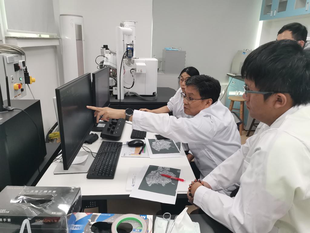 2024年8月26日,徐義剛院士與團隊成員通過掃描電鏡觀察嫦娥六號樣品特征。(中國科學(xué)院廣州地球化學(xué)研究所供圖)