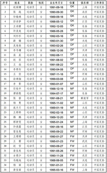 人民網(wǎng)北京5月18日電(楊磊)5月18日,中國足協(xié)在其官網(wǎng)公布了女足國家隊里約奧運(yùn)會參賽運(yùn)動員35人大名單。馬曉旭、王霜等人在列,門將王飛沒有進(jìn)入此次大名單。