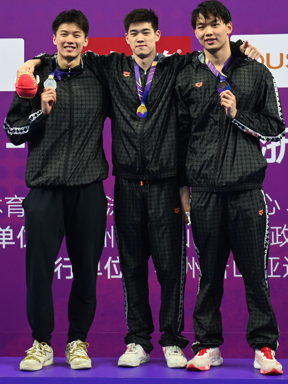 5月4日,分獲男子200米自由泳前三名的浙江隊選手潘展樂(中)、汪順(左)和洪金權在頒獎儀式上合影。新華社記者黃宗治攝