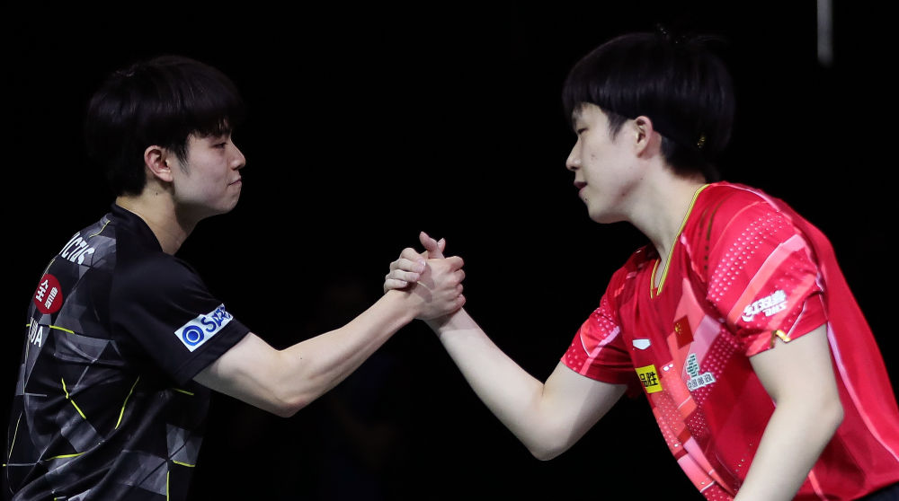 5月24日,王楚欽(右)和宇田幸矢賽后致意。 新華社記者 王東震 攝
