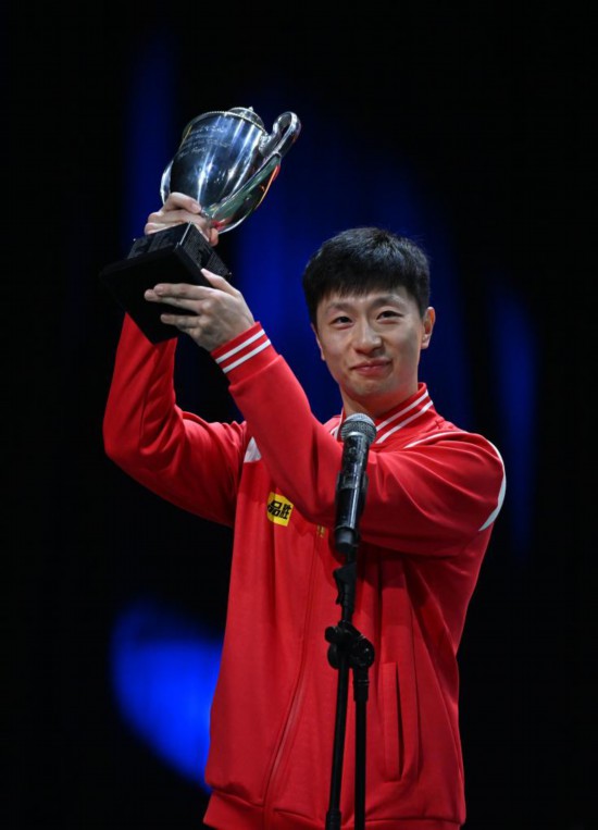 當(dāng)日兩場單打決賽之間,國際乒聯(lián)為2015年至2019年完成世乒賽男單三連冠的馬龍頒發(fā)了復(fù)刻圣·勃萊德杯。(蘇斌、謝江)