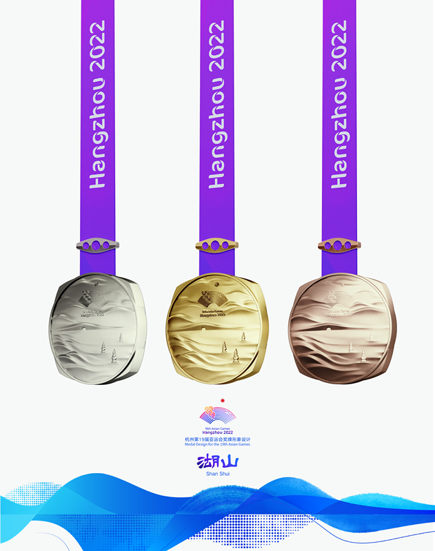 獎牌取名為“湖山”,它的設(shè)計靈感源自五千年良渚文明,展示中國江南文化,呈現(xiàn)杭州山水景觀。在亞運(yùn)會獎牌設(shè)計中首次將方形玉琮和圓形獎?wù)氯跒橐惑w,其中獎牌正面用凸出的線條勾勒出“三面云山一面城”的杭城畫卷,湖水漣漪,山巒起伏;獎牌背面,形似方形印章,寓意運(yùn)動員們在杭州亞運(yùn)會上留下美好的印記。