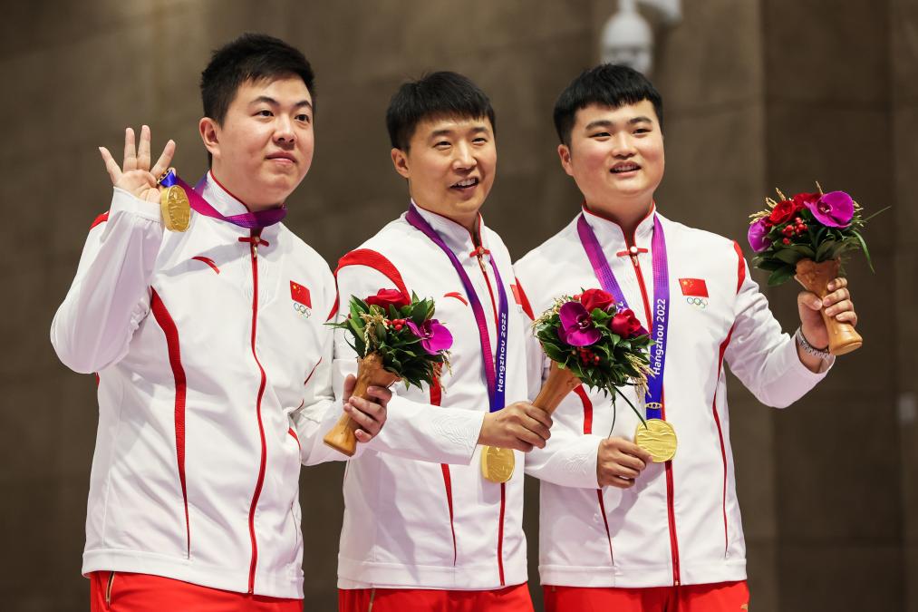 9月25日,男子25米手槍速射爭奪中,王鑫杰、劉楊攀、李越宏組成的中國隊以1765環(huán)的破世界紀錄成績奪得團體冠軍。