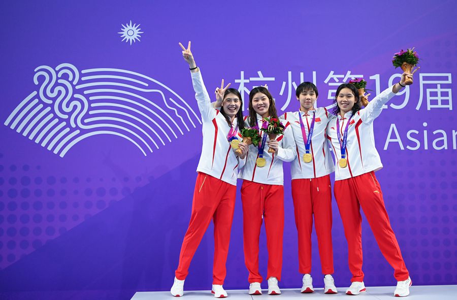 9月24日,女子4x100米自由泳接力決賽,由楊?,u、程玉潔、吳卿風(fēng)和張雨霏組成的中國隊優(yōu)勢明顯,最終以3分33秒96破賽會紀錄的成績奪得冠軍。