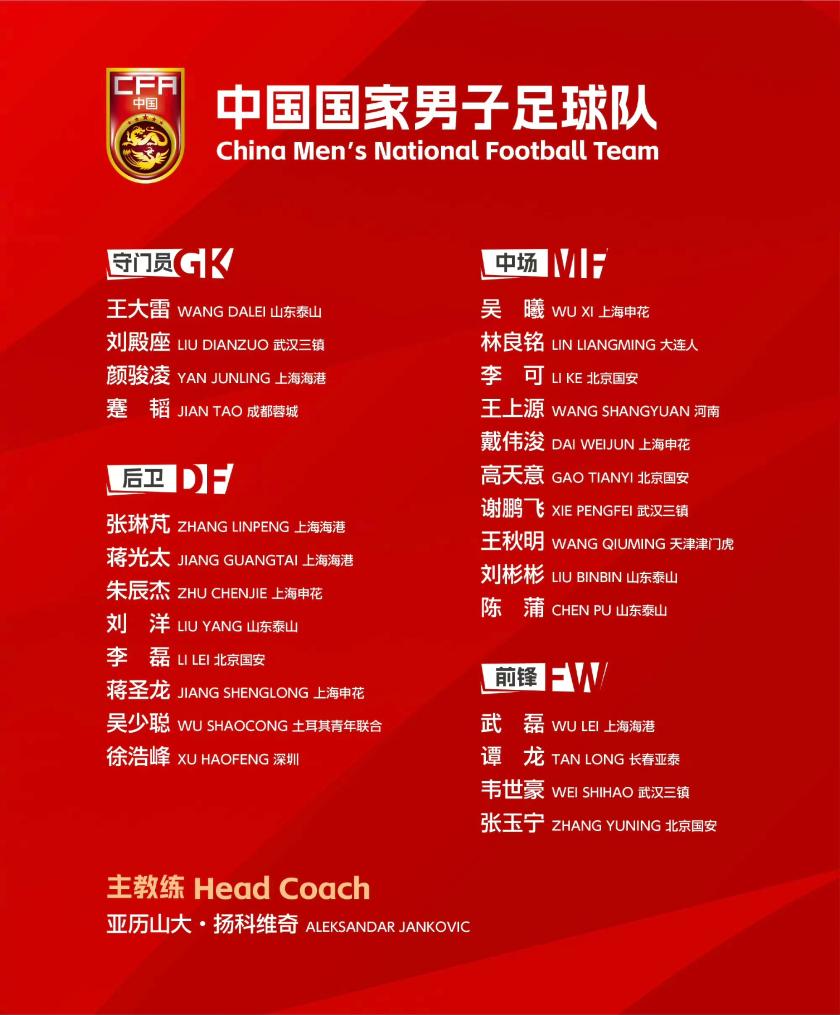 根據安排,由主教練揚科維奇帶領的中國男足將于12月17日至明年1月7日在上海、阿聯酋阿布扎比組織集訓,后赴卡塔爾多哈參加亞洲杯決賽階段賽事。