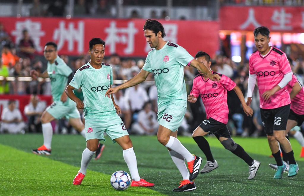 5月27日,卡卡(中)在“逐夢”冠軍明星公益賽中。當(dāng)日,“逐夢”冠軍公益賽在貴州省黔東南苗族侗族自治州榕江縣“村超”球場舉行。新華社記者 楊文斌 攝 亦或是第十二屆全國少數(shù)民族傳統(tǒng)體育運動會 用體育奏響中華民族一家親的時代強音