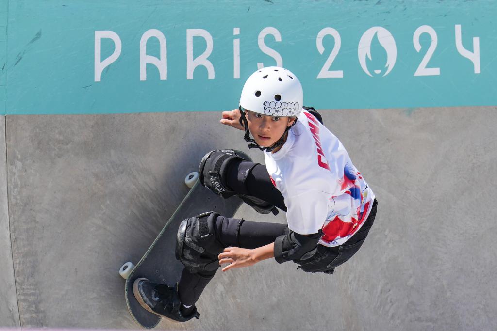 這是2024年8月6日,鄭好好在巴黎奧運會滑板女子碗池預(yù)賽中。新華社記者 杜宇 攝