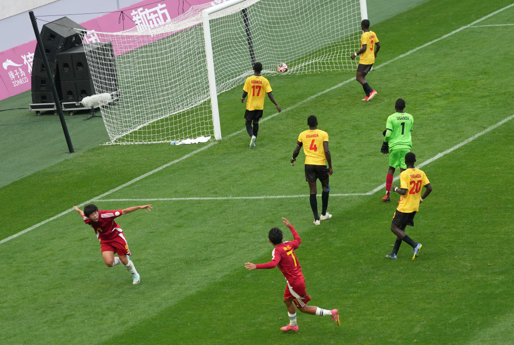 2024年5月26日,中國男子一隊球員劉誠宇(左一)慶祝進球。當(dāng)日,2024年國際中體聯(lián)足球世界杯賽落幕。中國男子一隊和中國女子二隊分別戰(zhàn)勝烏干達(dá)男子一隊和肯尼亞女子隊,雙雙奪冠。新華社記者 李鋼 攝