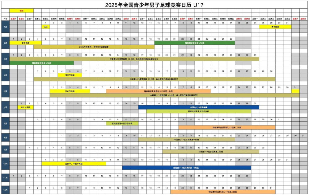 中國足協(xié)此次發(fā)布的統(tǒng)一賽歷涉及男子U13至U18共6個年齡段和女子U14至U18共5個年齡段的球員,包含中青賽、體校杯、職業(yè)俱樂部梯隊的比賽、校園足球高中男女總決賽等。不同賽事用不同顏色標(biāo)注,在表格中一目了然。中國足協(xié)青少部負(fù)責(zé)人程旭表示,這份賽歷是各部門共同推進的結(jié)果,不僅有助于賽事統(tǒng)籌和優(yōu)化,也能更好地凝聚力量,完善人才培養(yǎng)。