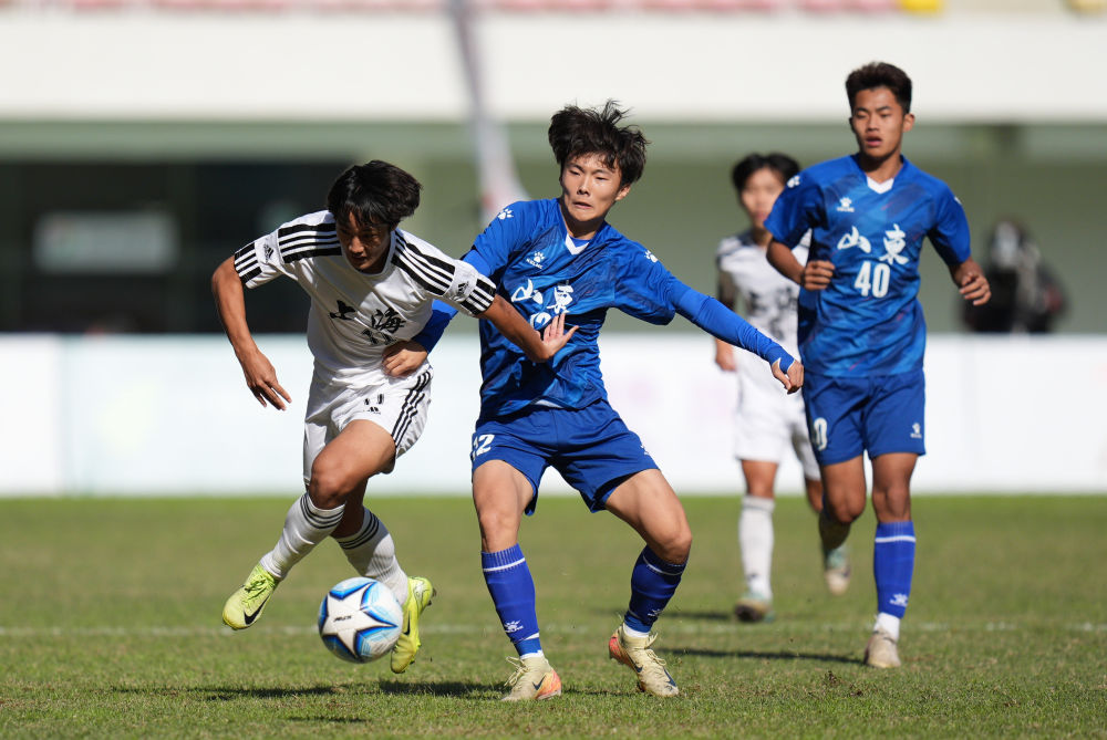 2024年11月27日,上海隊球員張俊杰(左一)和山東隊球員郝富博在第一屆全國青少年三大球運動會足球項目男子金牌賽中拼搶。新華社記者 薛宇舸 攝