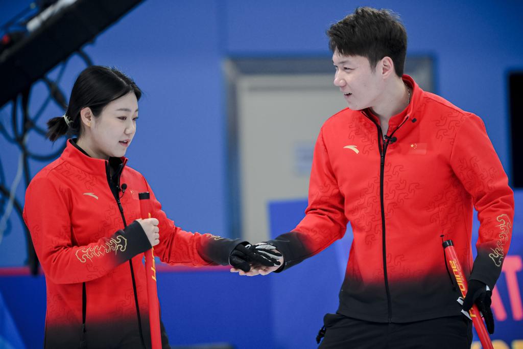 2月4日,中國隊選手韓雨(左)與隊友王智宇在比賽中交流。新華社記者 江漢 攝