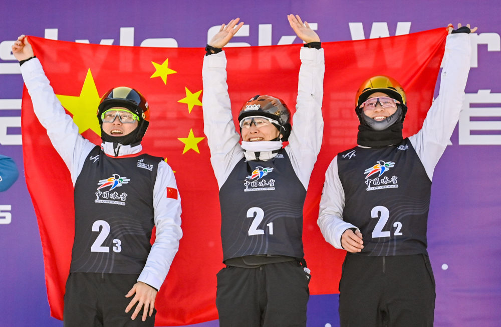 2月24日,在2024-2025賽季國際雪聯(lián)自由式滑雪世界杯(北大湖站)空中技巧混合團(tuán)體決賽中,由徐夢(mèng)桃、李天馬、齊廣璞組成的中國一隊(duì)獲得金牌。圖為中國一隊(duì)徐夢(mèng)桃(中)、李天馬(右)、齊廣璞在頒獎(jiǎng)儀式上。新華社記者 顏麟蘊(yùn) 攝
