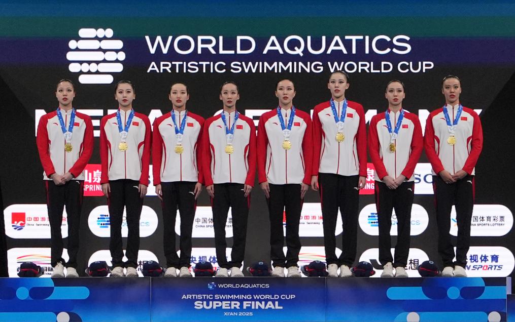 冠軍中國隊在集體技巧自選決賽頒獎儀式上。15日,在2025年花樣游泳世界杯總決賽集體技巧自選決賽中,中國隊獲得冠軍。新華社記者 李一博 攝