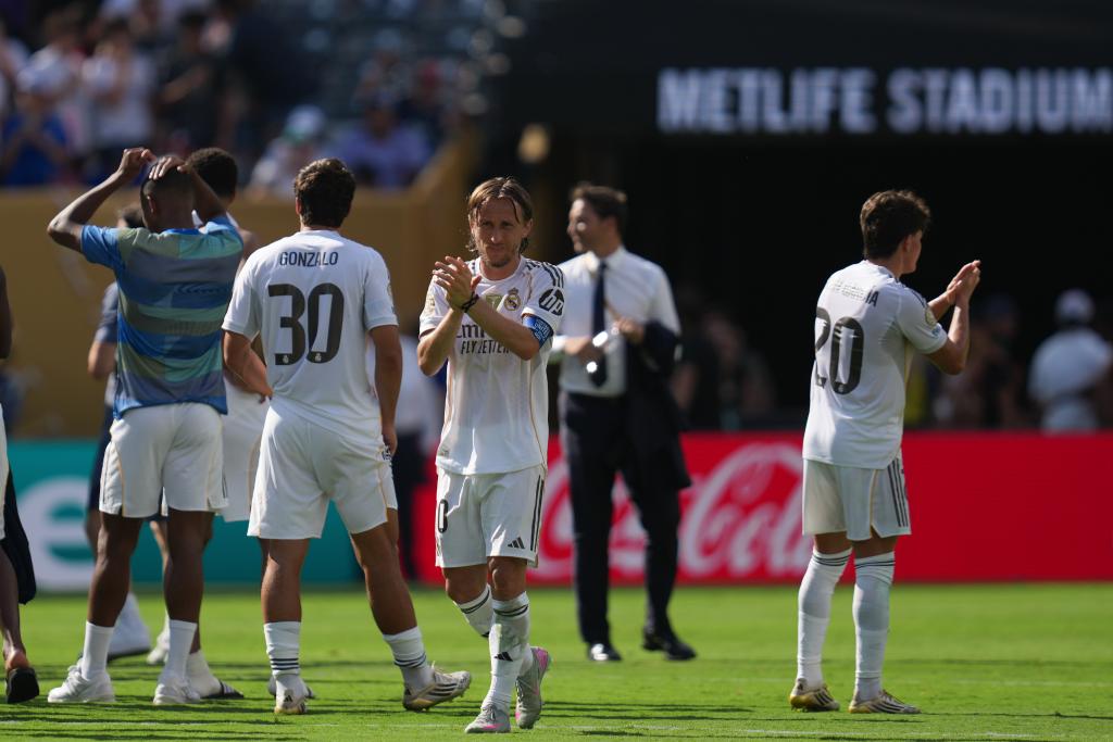 7月9日,在2025年國際足聯(lián)俱樂部世界杯(世俱杯)半決賽后,莫德里奇(中)在向觀眾致意,這是莫德里奇效力皇馬的最后一場(chǎng)比賽。新華社記者 黃宗治 攝