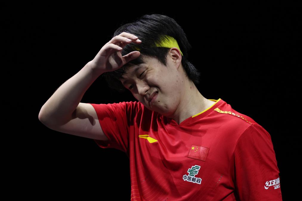 男單決賽在中國選手王楚欽和日本選手張本智和之間進行。圖為王楚欽在比賽中失分后。新華社記者 賈浩成 攝