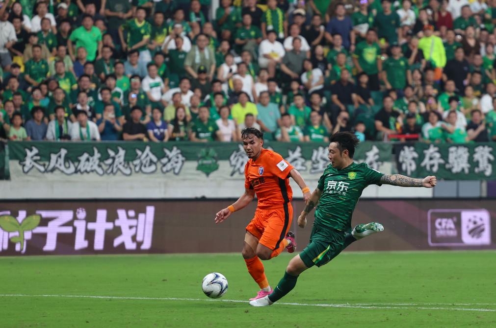 第38分鐘,老將王剛在右路突入禁區(qū)后勁射破門,幫助北京國安取得兩球領(lǐng)先。上半場補時階段,北京國安乘勝追擊,外援古加在禁區(qū)內(nèi)推射,再入一球。