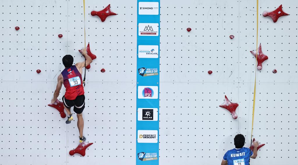 7月11日,中國(guó)選手龍見國(guó)(左)在2025攀巖世界杯霞慕尼站男子速度賽中。新華社記者 高靜 攝