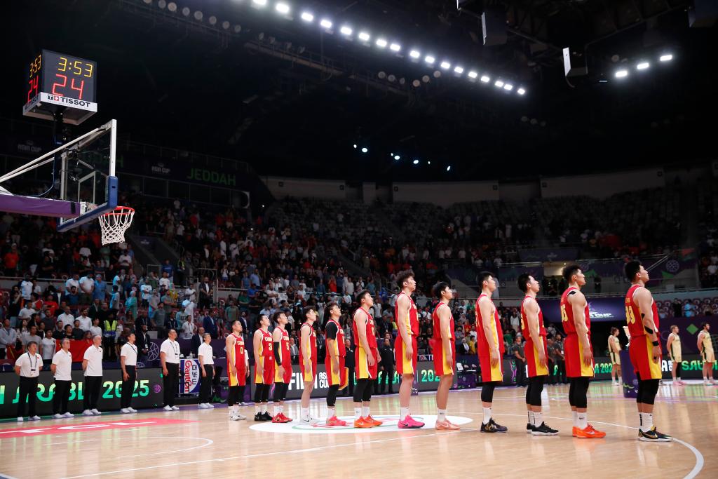 8月17日,在沙特阿拉伯吉達(dá)舉行的2025國際籃聯(lián)亞洲杯決賽中,中國隊(duì)89比90不敵澳大利亞隊(duì),獲得亞軍。圖為中國隊(duì)球員在賽前奏唱國歌儀式上列隊(duì)。新華社記者 王東震 攝