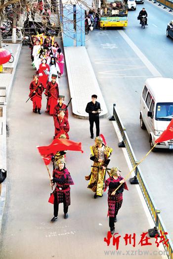 男的身披戰(zhàn)袍鎧甲,女的一襲古裝長裙,一支戰(zhàn)國時代的隊伍揮舞旗幟、佩帶長劍從忻州城區(qū)七一路走過?!笆遣皇桥碾娨晞×??”過往行人紛紛側(cè)目觀望。