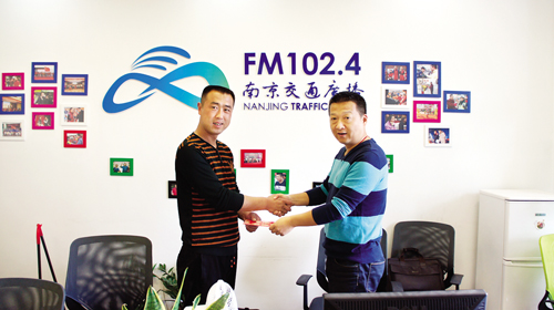 4月7日,在南京交通廣播“智勇在線”節(jié)目組,來自忻州市定襄縣的智杰(左)和主持人智勇在一起,并受到了該媒體的贊譽(yù)與獎勵(劉捷 攝) 說起智杰這個名字,人們可能有點(diǎn)兒淡忘,但說起“在南京救了一公交車人”的定襄青年,人們卻印象深刻。從開始微信朋友圈相傳的“定襄小伙智杰在南京救了70多名乘客”,到本報記者和智杰遠(yuǎn)赴南京實(shí)地求證,并在本報4月12日三版推出深度報道《千鈞一剎真英雄》,智杰這個樸實(shí)的定襄小伙一步步走進(jìn)了人們心里。他的事跡在市民中廣為流傳,甚至一些商家如山西海爾熱水器總代理段明剛在聽說他的事情后,深為感動,主動相送產(chǎn)品表示敬意。