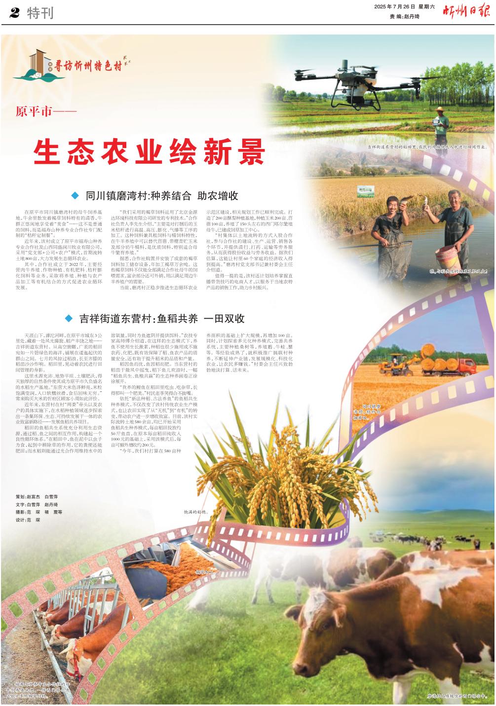 天涯山下,滹沱河畔,在原平市城東3公里處,藏著一處風(fēng)光旖旎、稻產(chǎn)豐饒之地——吉祥街道東營村。從高空俯瞰,廣袤的稻田宛如一片碧綠色的海洋,鋪展在逶迤起伏的群山之間。七月的風(fēng)掠過稻浪,長至齊膝的稻苗沙沙作響。稻田里,晃動著農(nóng)民進行田間管理的身影。