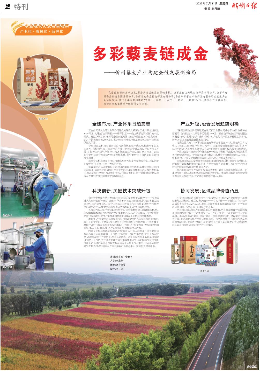 從五臺山麓的加工車間到靜樂的種植基地,從實(shí)驗(yàn)室的育種試管到超市貨架的精致包裝——這條貫穿一二三產(chǎn)的產(chǎn)業(yè)鏈,正改變著忻州農(nóng)業(yè)的基因。未來,將通過“藜麥+文旅”融合開發(fā)農(nóng)耕體驗(yàn)項(xiàng)目,建設(shè)藜麥主題康養(yǎng)小鎮(zhèn);推動高附加值產(chǎn)品出口歐盟市場。當(dāng)全鏈思維、科技賦能與共享發(fā)展深度融合時,被譽(yù)為“糧食之母”的藜麥正在黃土高原煥發(fā)新生,為資源型地區(qū)農(nóng)業(yè)轉(zhuǎn)型提供可復(fù)制的“忻州方案”。