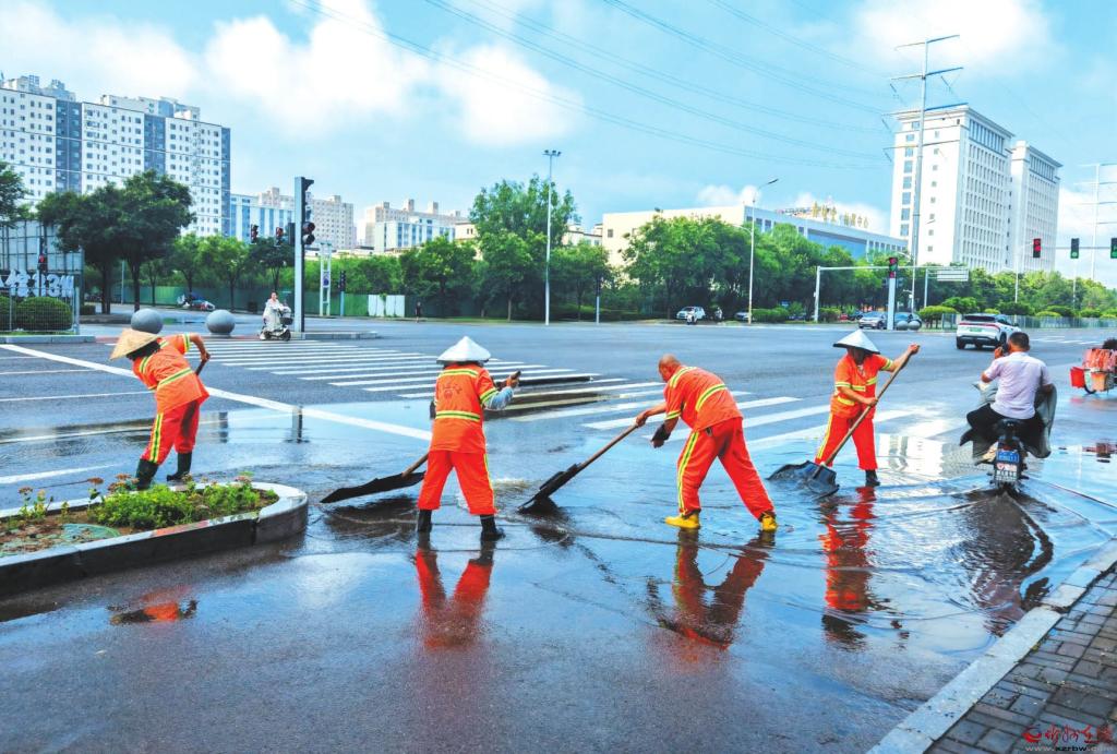 8月5日凌晨,我市降雨天氣造成城區(qū)部分道路路面積水。清晨,環(huán)衛(wèi)工人積極應(yīng)對(duì)雨情,對(duì)轄區(qū)內(nèi)路段開展排水清淤工作,保障市民日常出行。圖為環(huán)衛(wèi)工人在紫檀街路口清理積水。本報(bào)記者王陽攝