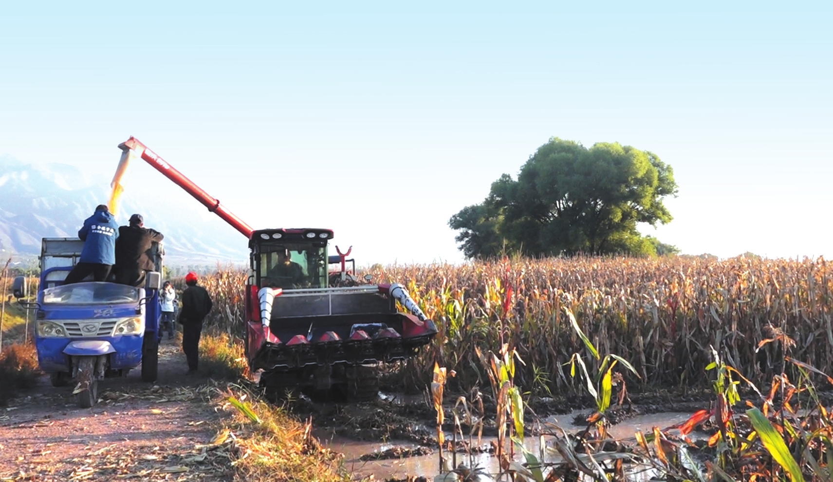 “突突”的引擎聲在濕漉漉的玉米地里轟鳴,來回穿梭中,金色的玉米在“吞吐”下脫粒,隨后如溪流般源源不斷地傾瀉而出,精準(zhǔn)地落入一旁等候的運輸車廂內(nèi),瞬間堆起了一座座豐收的小山。