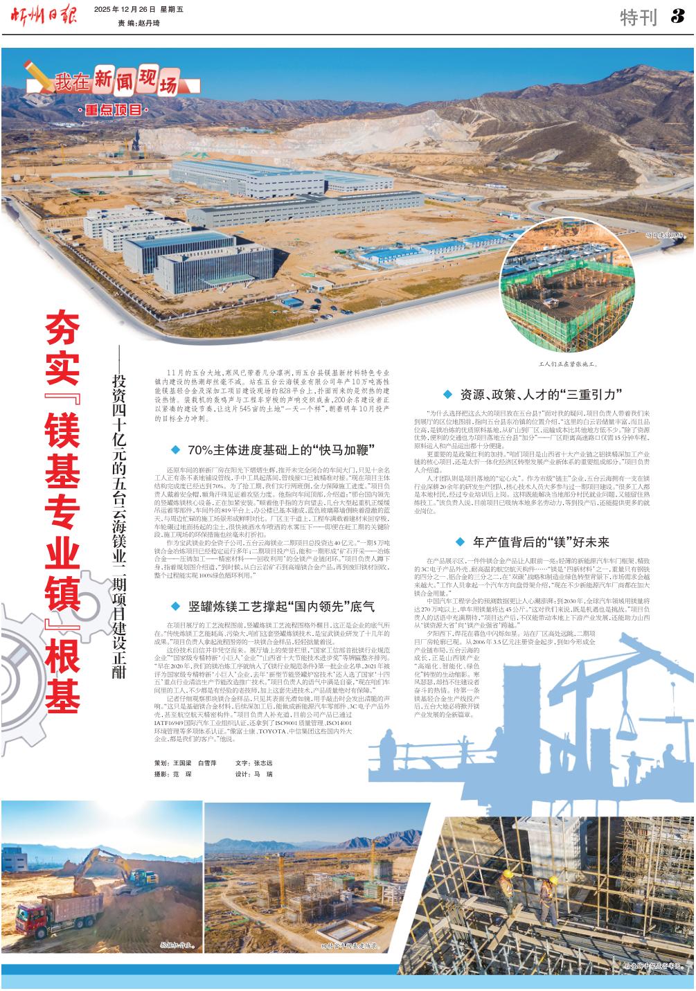 夕陽西下,焊花在暮色中閃爍如星。站在廠區(qū)高處遠(yuǎn)眺,二期項(xiàng)目廠房輪廓已現(xiàn)。從2006年3.5億元注冊資金起步,到如今形成全產(chǎn)業(yè)鏈布局,五臺(tái)云海的成長,正是山西鎂產(chǎn)業(yè)“高端化、智能化、綠色化”轉(zhuǎn)型的生動(dòng)縮影。寒風(fēng)瑟瑟,卻擋不住建設(shè)者奮斗的熱情。待第一條鎂基輕合金生產(chǎn)線投產(chǎn)后,五臺(tái)大地必將掀開鎂產(chǎn)業(yè)發(fā)展的全新篇章。