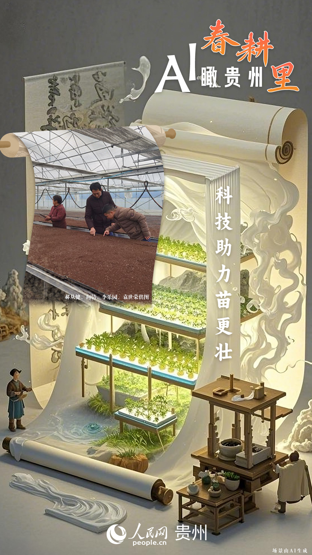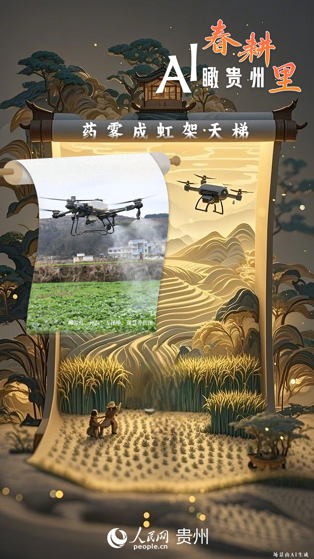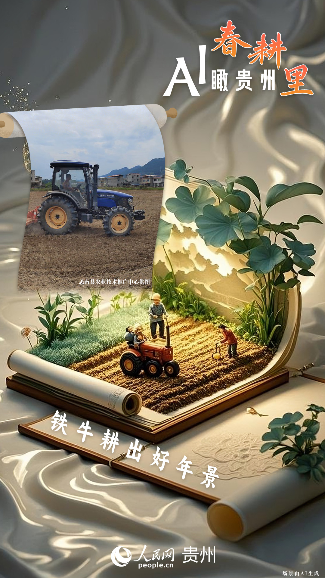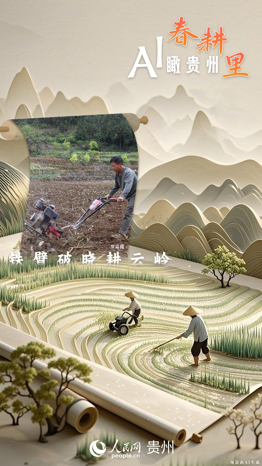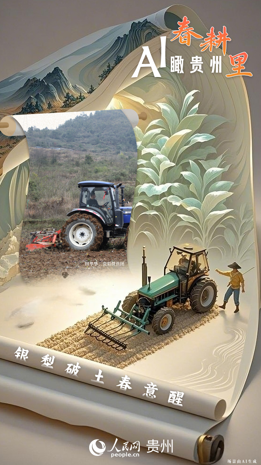 春回大地,萬物復蘇,黔地山川間正上演著一場生機勃勃的春耕盛景。傳統(tǒng)農耕與現(xiàn)代科技在這里交織,描繪出一幅幅充滿希望的畫卷。 春耕不僅是農時的序曲,更是科技與土地對話的現(xiàn)場。在貴州這片喀斯特地貌與民族文化交織的土地上,春耕正經歷一場靜默的變革:無人機掠過千年梯田,算法解析紅壤墑情,覆膜機織就“智能外衣”,而彎腰勞作的農人,依然用繭手傳遞著古老農耕文明的溫度。 本期跟隨AI一起描繪貴州春耕里的故事。