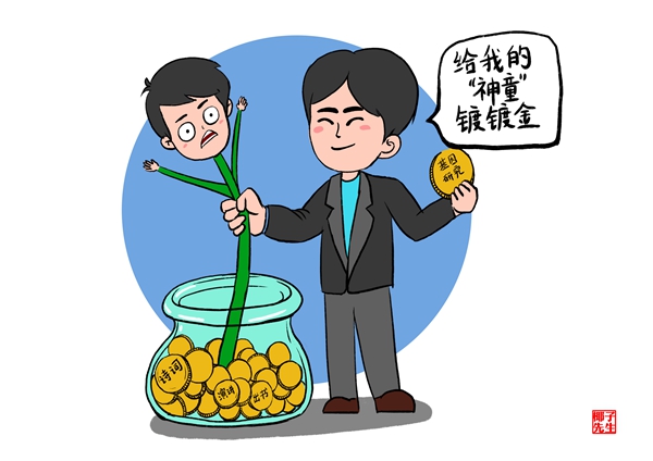 “人造‘神童’害了誰(shuí)”系列漫評(píng)之一: 神童,本意是指才賦出眾的兒童,他們幼而敏慧,在詩(shī)文、音樂(lè)或某些技藝上的表現(xiàn)優(yōu)于同齡人,甘羅、司馬光、曹沖等都是人們耳熟能詳?shù)纳裢怼?/span> 神童早慧,順其自然的培養(yǎng)或可激發(fā)他們的最大潛能,讓他們成為棟梁之才。但現(xiàn)實(shí)是,一些家長(zhǎng)打著“一切都是為孩子好”的旗號(hào),拔苗助長(zhǎng)、精致包裝、夸張營(yíng)銷,不計(jì)后果人為制造所謂的“神童”和“天才”。從靠“癌癥研究”獲全國(guó)大獎(jiǎng)的小學(xué)生到日均寫(xiě)詩(shī)2000首的16歲“天才少女”,各式各樣橫空出世的“人造神童”令人匪夷所思。 如此“鍍金”是害了孩子。學(xué)習(xí)是一場(chǎng)馬拉松,投機(jī)取巧和急功近利違背兒童成長(zhǎng)規(guī)律,名不副實(shí)的光環(huán)終究會(huì)給孩子帶來(lái)負(fù)擔(dān),甚至誤導(dǎo)孩子一生。父母之愛(ài)子,則為之計(jì)深遠(yuǎn)。想讓這份愛(ài)有個(gè)正確的打開(kāi)方式,就請(qǐng)多傾聽(tīng)孩子的心聲,更加關(guān)注他們的身體素質(zhì)、道德情操、交往能力、自理能力,多一份平常心和實(shí)事求是,讓孩子能夠自由健康成長(zhǎng)?。ㄎ淖郑憾?手繪:趙凱) (責(zé)任編輯:梁艷) |
