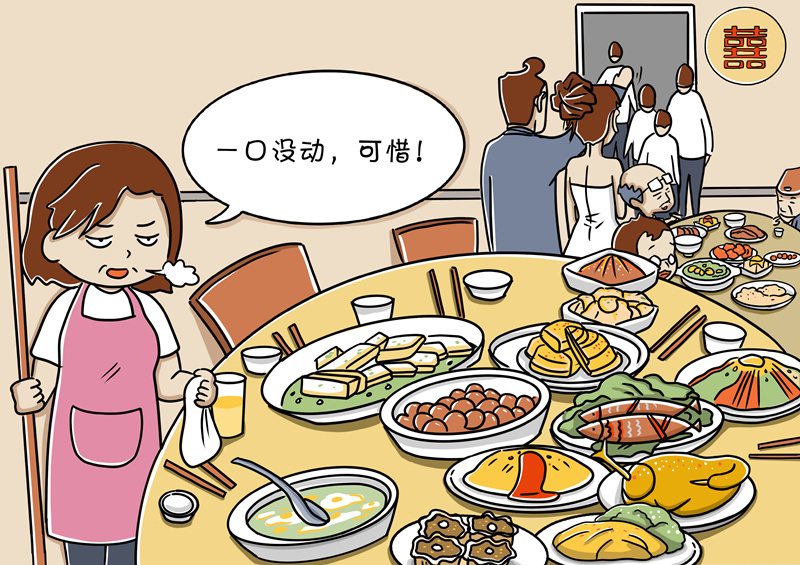 杜絕“剩宴”需要社會合力。結(jié)婚“剩宴”并不是短時間形成的,也不是個別現(xiàn)象,因此,根治這種陋習(xí)、在全社會培養(yǎng)節(jié)約意識和節(jié)儉習(xí)慣是一項長期任務(wù),也是一項全民行動,需要社會各界多元化、多角度共同推進。比如,黨員干部以身作則,率先垂范;餐飲行業(yè)增強節(jié)約意識,改進服務(wù),合理優(yōu)化供應(yīng)標(biāo)準(zhǔn)。只有人人轉(zhuǎn)變觀念,共同做厲行節(jié)約、反對浪費的踐行者、宣傳者和監(jiān)督者,才能帶動形成良好社會風(fēng)氣。(文字:馬若虎 漫畫:甘甜)