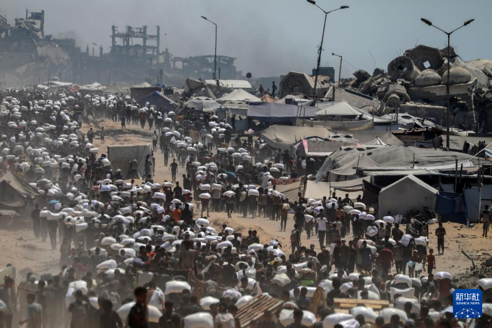 7月27日,在加沙地帶北部城鎮(zhèn)拜特拉希亞,人們領取通過邊境口岸進入加沙的援助物資。新華社發(fā)(里澤克·阿卜杜勒賈瓦德攝)