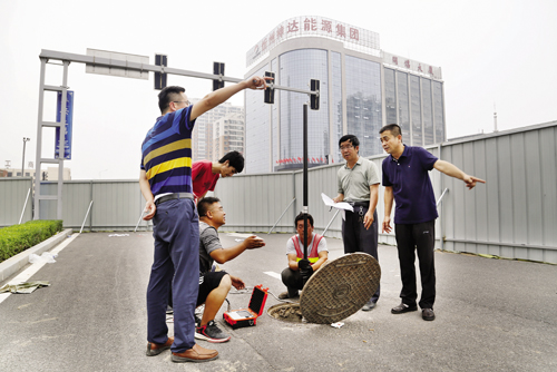 圖為技術(shù)人員現(xiàn)場(chǎng)檢測(cè)分析塌陷原因