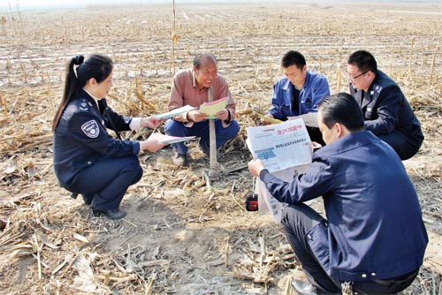 為了將《中華人民共和國(guó)大氣污染防治法》和《五臺(tái)縣人民政府嚴(yán)防森林火災(zāi)的通告》宣傳到戶、到人,五臺(tái)縣環(huán)保局組織工作人員,分組劃片深入到田間地頭,面對(duì)面讀報(bào)給農(nóng)民聽,為農(nóng)民解釋燒秸稈、燒荒等野外違規(guī)用火行為的危害。臺(tái)城鎮(zhèn)西關(guān)村66歲的農(nóng)民張存在說:“你們這樣解釋,咱懂。我家4畝地的秸稈保證不燒一根。”圖為五臺(tái)縣環(huán)保局工作人員在田間地頭宣傳環(huán)境保護(hù)相關(guān)知識(shí)。(金俊賢 辛宇 攝影報(bào)道)