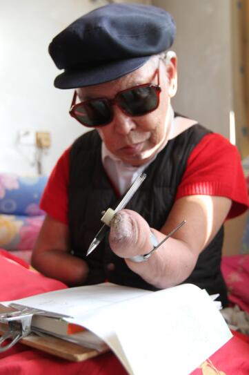 父親有句名言:“我缺手缺腳不缺鈣!”有人說他是鋼人,有人說他是特殊材料的人,他的意志確實不是一般的剛強,無人能比!冬閑時帶領(lǐng)村民打水井,他親自下井指揮,上來后鐵腿取不下來,與腿凍在了一起,血肉模糊的,我們都心疼得哭,他說疼才好呢,疼就知道自己還活著。為了制訂山地改造計劃,親自爬山越嶺地考察,他帶著17斤重的鐵腿,爬山太不容易了:站著走腿被磨疼了,就卸下鐵腿掛在脖子上跪著走;跪著走磨破了皮肉就爬著走;下山的時候就更困難了,站著走經(jīng)常摔跤,又不能跪著走或爬著走,他干脆扔下鐵腿身體抱成團滾著走。他經(jīng)常是四肢的創(chuàng)傷面剛結(jié)痂,又被磨破,流血化膿是常有的事。站著走,跪著走,爬著走,滾著走,這是父親當(dāng)年的四種走法…… 我父親真的是特別有想法特別有眼光的人,五六十年代他就想到辦圖書館和夜校,打水井、架水橋,填溝造田,架電通電:一個個山里人想都沒想過的大工程,都是父親的點子。 最為村民們津津樂道的是改造三條大溝的事,那時候村里溝多地少,有三條不能耕種的大溝。父親帶人把其中的臘條溝和舍地溝兩條大溝削高填低,平整成良田。但在改造最深的趕牛溝的時候,父親考慮到這是夏季泄洪的主要通道,不能一填了之。經(jīng)過反復(fù)察看地形地勢,他決定采用起碹的方法,保留趕牛溝的泄洪功能。他指揮鄉(xiāng)親們運來石頭,先在趕牛溝上碹起涵洞,然后再削高填低,在涵洞之上平出了60多畝良田。 村里的所有工程,包括改造趕牛溝、開井架渠,都是在父親帶領(lǐng)大家用自制的簡陋工具完成的,連砌井和修水渠的水泥都是村民們自己燒制的!他還號召成立副業(yè)社,鐵匠社、木工社、米皮社、饃饃社等,增加農(nóng)民收入,這在當(dāng)時的山溝溝里,可都是新鮮事兒。在父親的帶領(lǐng)下,村里面貌發(fā)生了翻天覆地的變化,張家泉村在縣里第一個有了拖拉機;第一個通了電;人均收入實現(xiàn)了全鎮(zhèn)第一,一個多年的落后村成了先進村,因為貧窮多年沒娶進媳婦的小村莊,迎來了一個個新娘,整個村子活了起來。 盡管生活艱辛,父親依然活潑樂觀。他當(dāng)村支書的時候,自己編快書、寫歌詞、說相聲、演小品、吹口琴,農(nóng)閑的時候,他就自己編歌領(lǐng)著大家唱,還在村里編排話劇。 25年的村支書生涯,父親興辦學(xué)校、發(fā)展教育;他發(fā)動群眾填溝造田、興修水利、架電修路、種植林果,千方百計發(fā)展農(nóng)業(yè),歷經(jīng)艱難,終于帶領(lǐng)鄉(xiāng)親們走上了致富之路,過上溫飽殷實的好日子。 書不盡的極限人生 1982年,父親大病一場,漸漸體力不支,主動辭去了村支書的職務(wù)。家人如釋重負(fù),覺得他終于可以放松下來過過悠閑的日子了??墒遣痪?,父親又有了新的方向——寫書!他沒手沒腳,怎么想到寫書了呢?父親在《極限人生》里提到了兩個因緣:第一個,死去戰(zhàn)友的臨終囑托。父親的指導(dǎo)員犧牲前說過:“一個連的消亡,在戰(zhàn)爭史上算不了什么,但你要想辦法把這壯舉記錄成文,傳給后代,這很有意義。”第二個,共產(chǎn)黨人的使命召喚著他去寫:一次父親應(yīng)邀去一所中學(xué)作報告,上學(xué)的重外甥跑來問他:“舅姥爺,同學(xué)們議論說,當(dāng)年你們打仗那么拼命,是不是太傻了?您到處給人作報告,是不是拿了人家錢了?”這些話深深地刺痛了父親,作為歷史的見證人,作為共產(chǎn)黨人,他覺得自己必須告訴孩子們,世界上還有比錢更重要的東西,還有很多安身立命的道理,他下定決心,一定要把那段歷史寫下來。 1987年,在專程來看望的遲浩田將軍鼓勵下,父親終于拿起了筆。他讓母親把被子疊成“方塊”,墊在大腿上,再把寫字板放在被子上,弓背低頭,用嘴含著筆嘗試寫字??谒樦P柄往下流,浸濕了稿紙,換一張重新寫!開始每天只能寫十幾個字。后來由于長期彎腰弓背,父親頭暈?zāi)垦?,各處傷口的神?jīng)疼痛難忍,似乎又經(jīng)歷了一次次手術(shù)的痛苦。 用嘴含筆寫,殘臂夾筆(抱臂)寫,鐵圈套筆寫。整整7年??喟究鄬懥?年,反復(fù)修改了7遍。2000多個日日夜夜,父親翻爛了四本字典,很多時候,胳膊翻書不方便,他就用嘴唇翻,用舌頭翻。用掉半噸稿紙,終于在1996年7月,出版了33萬字的自傳體小說《極限人生》。 拿到新書的那天,父親把自己關(guān)在屋里,恭恭敬敬地在扉頁上寫滿了戰(zhàn)友的名字,然后跪著將它點燃。他長舒了一口氣,卸下背了46年的重托。 父親除了通過寫書的方式傳播革命精神,還經(jīng)常作報告。他44年間做過1000多場報告會,早在1952年清明節(jié),泰安榮軍休養(yǎng)所附近的一所學(xué)校請父親去作報告,他第一次感悟到自己作為一個傷殘軍人的價值,也第一次看到了革命傳統(tǒng)教育報告的作用,他下決心把這條路走下去。后來邀請他作報告的單位絡(luò)繹不絕。從1952年到1996年,他有請必到,不收取任何報酬,父親的報告場場都引起強烈反響,因此得了“報告大王的稱號”。 英雄的鐵骨柔腸 在大家眼中父親留下了抹不掉的硬漢形象,但他是鐵骨柔腸。 父親母親的孝順是村里出了名的,那時候正值農(nóng)村推行火葬,但老觀念的村民都不愿意把逝去的老人火葬。奶奶病重期間,父親日夜守候在床前,用斷臂不停地給奶奶揉肚子。奶奶去世前反復(fù)叮囑父親:“娘這一輩子不容易,在陽間沒享什么福,我死