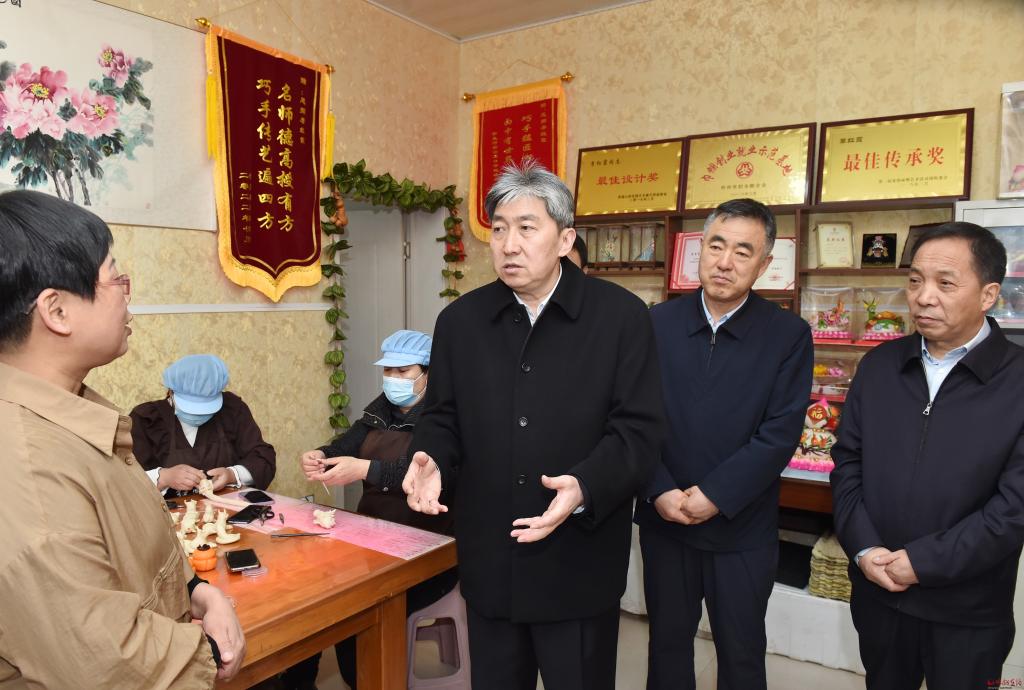 非遺傳承人李紅霞主要從事面塑工藝品和花饃制作與銷售工作,由她創(chuàng)辦的紅霞鄉(xiāng)情守藝坊,吸收了當?shù)責o業(yè)和老弱病殘人員20余人。走訪中,朱曉東來到李紅霞處,詳細了解面塑的歷史、現(xiàn)狀、未來發(fā)展方向,詢問她在經營、培訓、傳承中存在的困難和問題。朱曉東指出,非遺傳承人是非物質文化遺產重要的承載者和傳承者,在傳統(tǒng)文化和民間藝術的延續(xù)發(fā)展中發(fā)揮著關鍵性作用。要積極主動為傳承人搭建展示推廣平臺,讓珍貴的傳統(tǒng)技藝有序、有效傳承下去。希望傳承人進一步堅定文化自信,結合時代發(fā)展的特點,不斷推陳出新,做好產品研發(fā)和創(chuàng)新,注重實用價值轉化,在宣傳、品質、特色和工業(yè)化、標準化方面下功夫,開展好授徒傳藝,賦予非遺項目新的活力,將“小花饃”產業(yè)做大做強。
