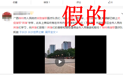 在一些微信群里,“柳州市獎勵援鄂醫(yī)療隊(duì)員們,每人獎勵一輛汽車,獎勵的車門上每輛都已噴上抗疫援鄂‘英雄’字樣,此車上牌后終身在本市內(nèi)任何停車場(位)不收費(fèi)”的信息比比皆是。在抖音和微博平臺,還有不少網(wǎng)友以該信息為基礎(chǔ),配上了迎接援鄂抗疫英雄回柳的畫面,制作成了短視頻在網(wǎng)絡(luò)上傳播,加劇了虛假信息進(jìn)一步傳播。