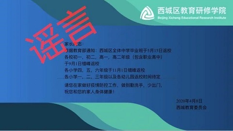近日,“北京高三4月27日開學(xué),六年級和初三5月11日開學(xué)” 、“西城區(qū)全體中學(xué)畢業(yè)班5月15日返?!?、“北京某區(qū)教委接到通知,確認(rèn)9月1日前不會復(fù)學(xué)”等一系列消息在網(wǎng)上流傳。