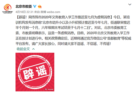 真相:北京市委教育工委、市教委明確表示,這是一條虛假消息。目前,2020年北京義務(wù)教育入學(xué)工作正在按計劃進行中。相關(guān)政策確定后,近期將通過官方微信公號“首都教育”等權(quán)威平臺發(fā)布。
