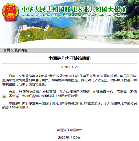 真相:4月20日,中國駐幾內(nèi)亞使館通過官方網(wǎng)站發(fā)布聲明表示,使館對此高度重視并進行核實,相關(guān)內(nèi)容純屬捏造。對此公然造謠、破壞中幾友誼和中非友誼的行為表示憤慨和譴責(zé)。