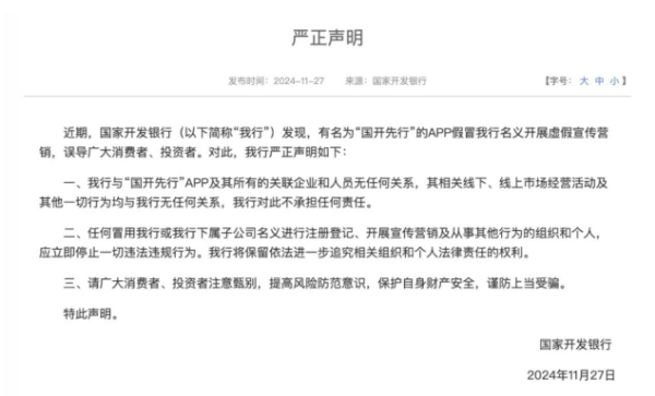 詳情:近期,有名為“國(guó)開(kāi)先行”的APP假冒國(guó)家開(kāi)發(fā)銀行名義開(kāi)展虛假宣傳營(yíng)銷(xiāo),誤導(dǎo)廣大消費(fèi)者、投資者。對(duì)此,國(guó)家開(kāi)發(fā)銀行于11月27日在官網(wǎng)發(fā)布《嚴(yán)正聲明》: