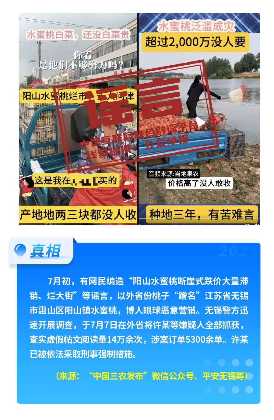此外,7月份正值暑期旅游旺季和水果等農(nóng)產(chǎn)品收獲季,有自媒體、商家借機(jī)編造傳播涉文旅及農(nóng)產(chǎn)類謠言,干擾市場秩序,侵害消費(fèi)者權(quán)益。有商家違規(guī)使用人民大會堂建筑圖片標(biāo)識和名稱,仿冒人民大會堂賬號,非法售賣、倒賣參觀門票,損害游客權(quán)益。個別商家剪輯發(fā)布“江蘇無錫陽山水蜜桃斷崖式跌價、大量滯銷、爛大街”謠言視頻,再借機(jī)兜售假冒的陽山水蜜桃,博人眼球惡意營銷,擾亂市場秩序。所謂“峨眉山人猴大戰(zhàn),游客墜崖,猴王被當(dāng)場擊斃”景區(qū)安全事件一度傳得沸沸揚(yáng)揚(yáng),相關(guān)視頻以驚悚情節(jié)博取關(guān)注,畫面實際是用AI合成拼接制作。